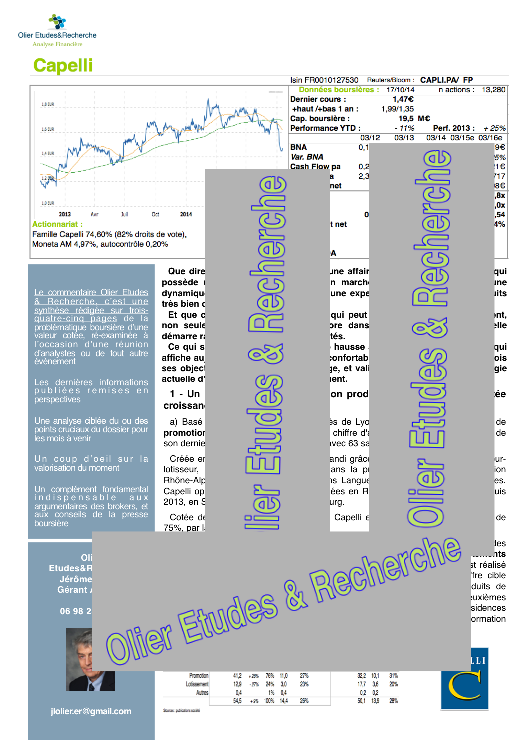 Que dire de Capelli, sinon que c'est une affaire de promotion immobilière qui possède une belle dynamique, sur un marché peu porteur a priori, et une dynamique solide a priori puisque fondée sur une expertise forte et une offre produits très bien ciblée.