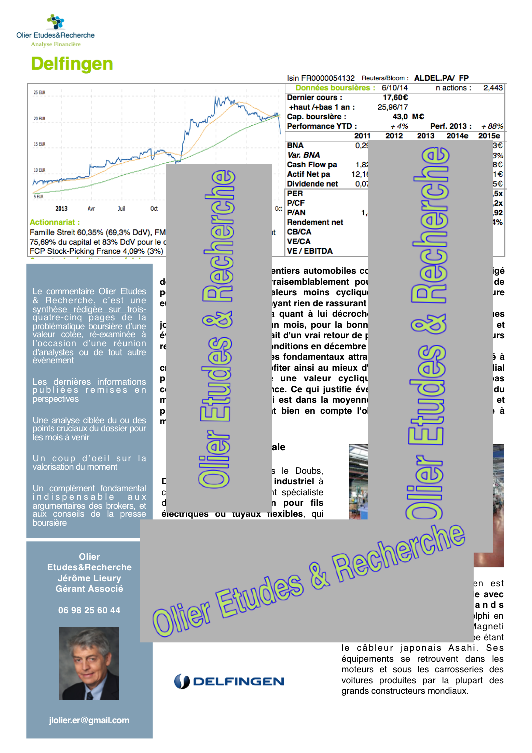 Toutefois, nonobstant des fondamentaux attrayants, notamment la capacité à croître globalement et profiter ainsi au mieux d'un marché automobile mondial porteur, Delfingen reste une valeur cyclique, et qui n'autofinance pas complètement sa croissance. Ce qui justifie éventuellement le PER modéré du moment pour cette small-cap, à 7,5x 2015e, qui est dans la moyenne des autres ETI du secteur, et prend aussi apparemment en compte l'objectif affiché de croissance à moyen-terme, tel que valorisé par l'analyse financière.