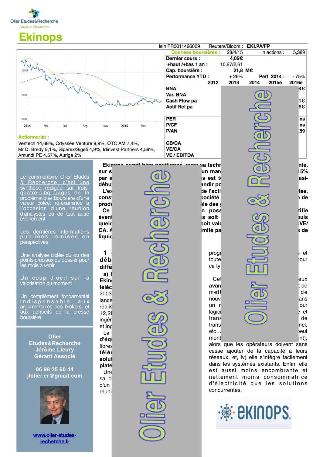 Ekinops est un équipementier télécom qui paraît bien positionné, avec sa technologie nouvelle et différenciante, sur son créneau du transport optique, un segment du marché des réseaux à très hauts débits, qui devrait croître de ≥ +15% par an à l'avenir. Ekinops est toutefois une micro-cap et encore un acteur quasi-débutant dans son métier, et qui doit grandir pour accéder à la rentabilité. société lance une nouvelle génération de produits et attaque résolument la clientèle des grands opérateurs Tier 1 ou Tier 2. Ce potentiel de croissance, et un possible attrait spéculatif, justifie que le cours d'Ekinops soit bien orienté malgré tout depuis quelques temps déjà, et que la société soit valorisée à un bon niveau à 1,33xVE/CA. Alors que le risque à la baisse est limité, selon notre analyse financière fondamentale, par un bilan solide et un matelas de liquidités encore conséquent.