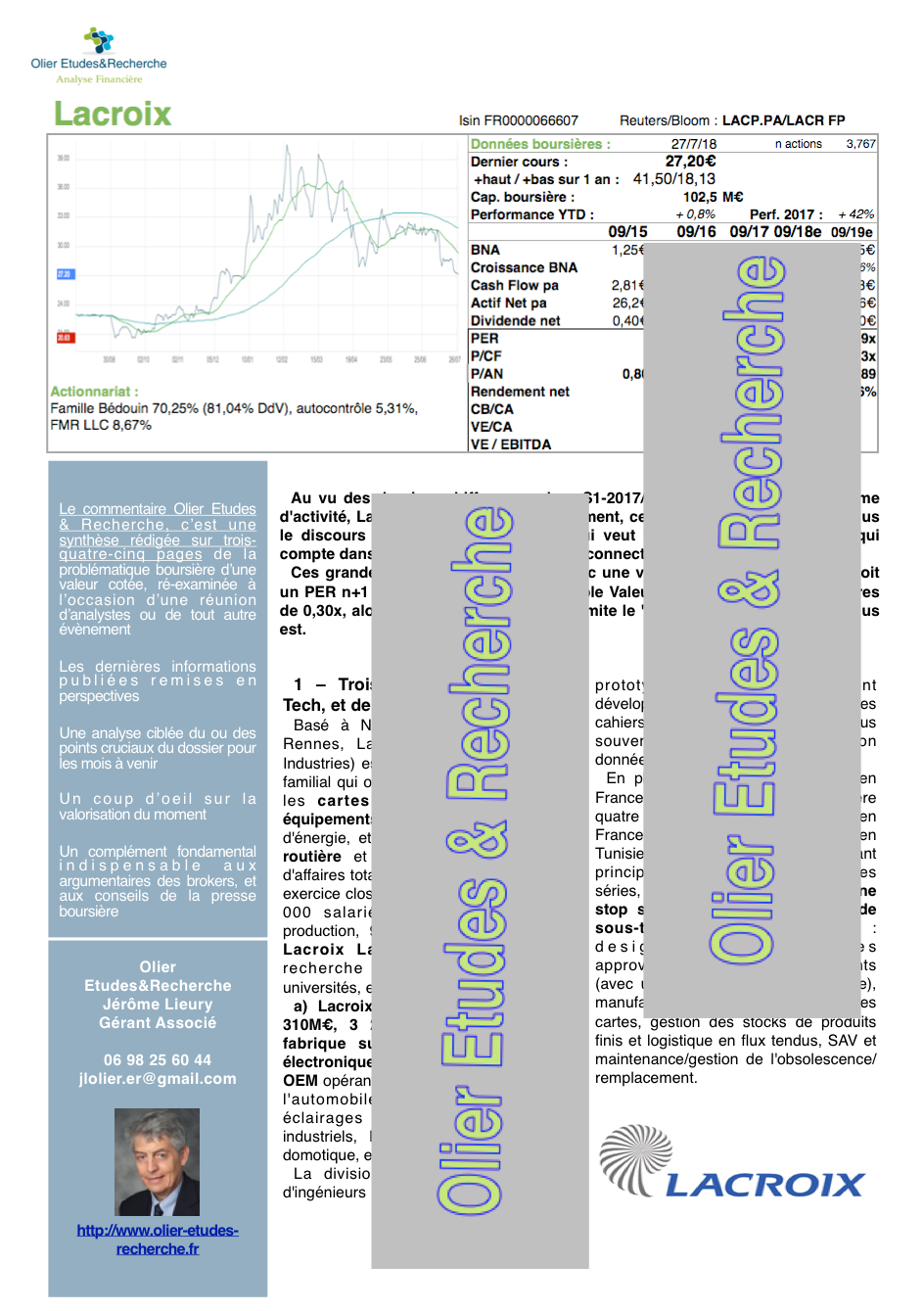 Au vu des derniers chiffres : un bon premier semestre 2017/18 et un très bon 3ième trimestre en terme d'activité, Lacroix accélère son redressement, ce qui crédibilise de plus en plus le discours de la direction familiale, qui veut faire du groupe un acteur qui compte dans le "smart world" des objets connectés et de la nouvelle mobilité.