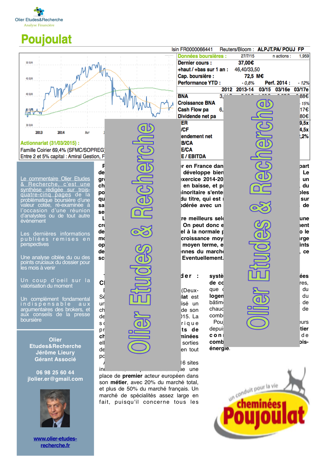 Le groupe Poujoulat est largement le premier acteur français, voire Européen, dans son métier : les conduits de cheminées et les cheminées. Il a réalisé un exercice 2014-2015 des plus décevants, toutefois, mais devrait bien se rattraper cette année, grâce à la reprise en cours de la construction neuve, et du marché immobilier dans son ensemble. Dans notre analyse financière, le scénario le moins positif à moyen terme est valorisé avec 3 points de PER en moins que la moyennes du marché, ce qui laisse apparemment un "upside" significatif à cette small-cap, ce scénario étant le plus probable dans une conjoncture macro-économique en nette amélioration.